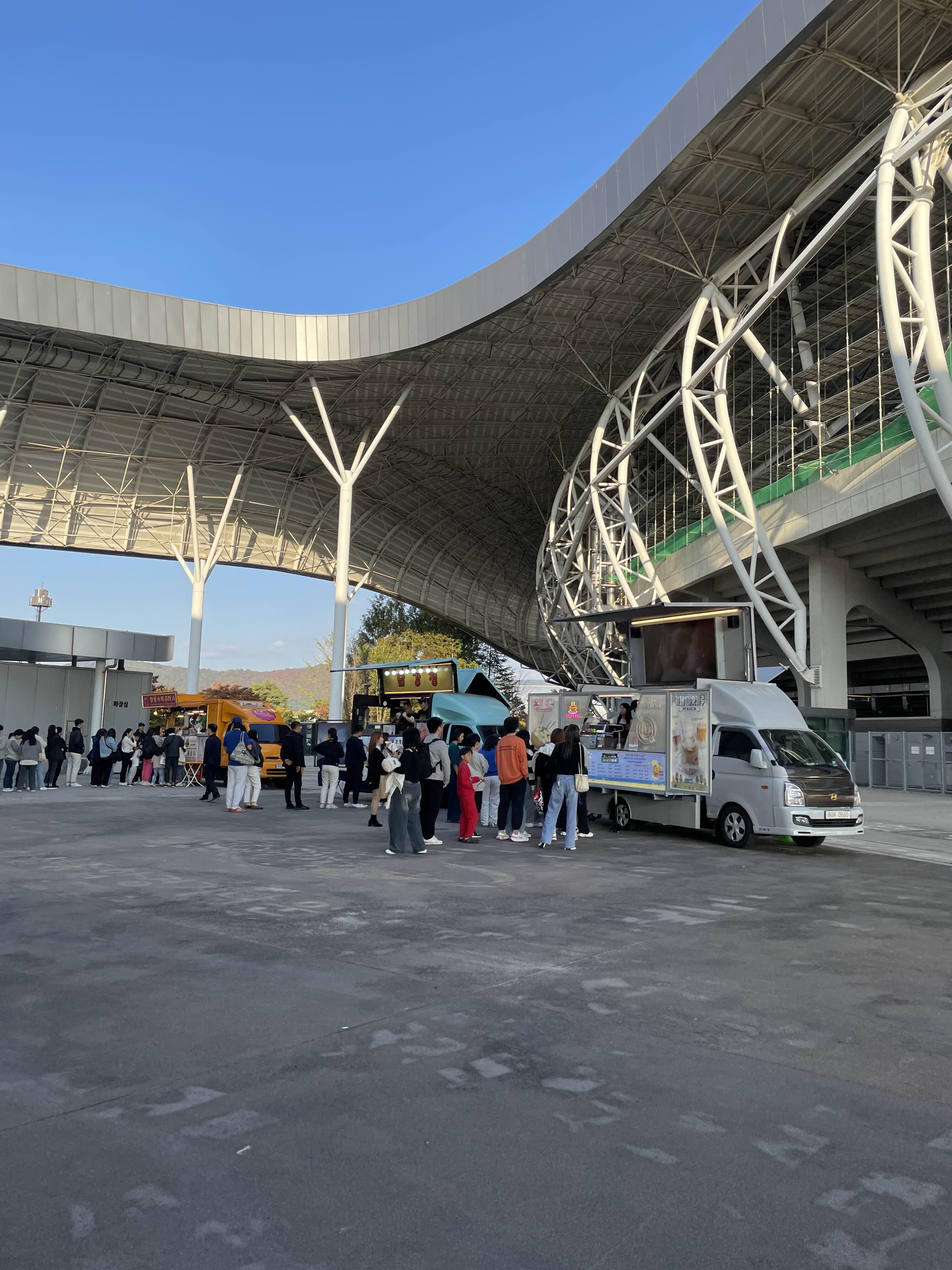경기장 앞에 푸드 트럭 3대